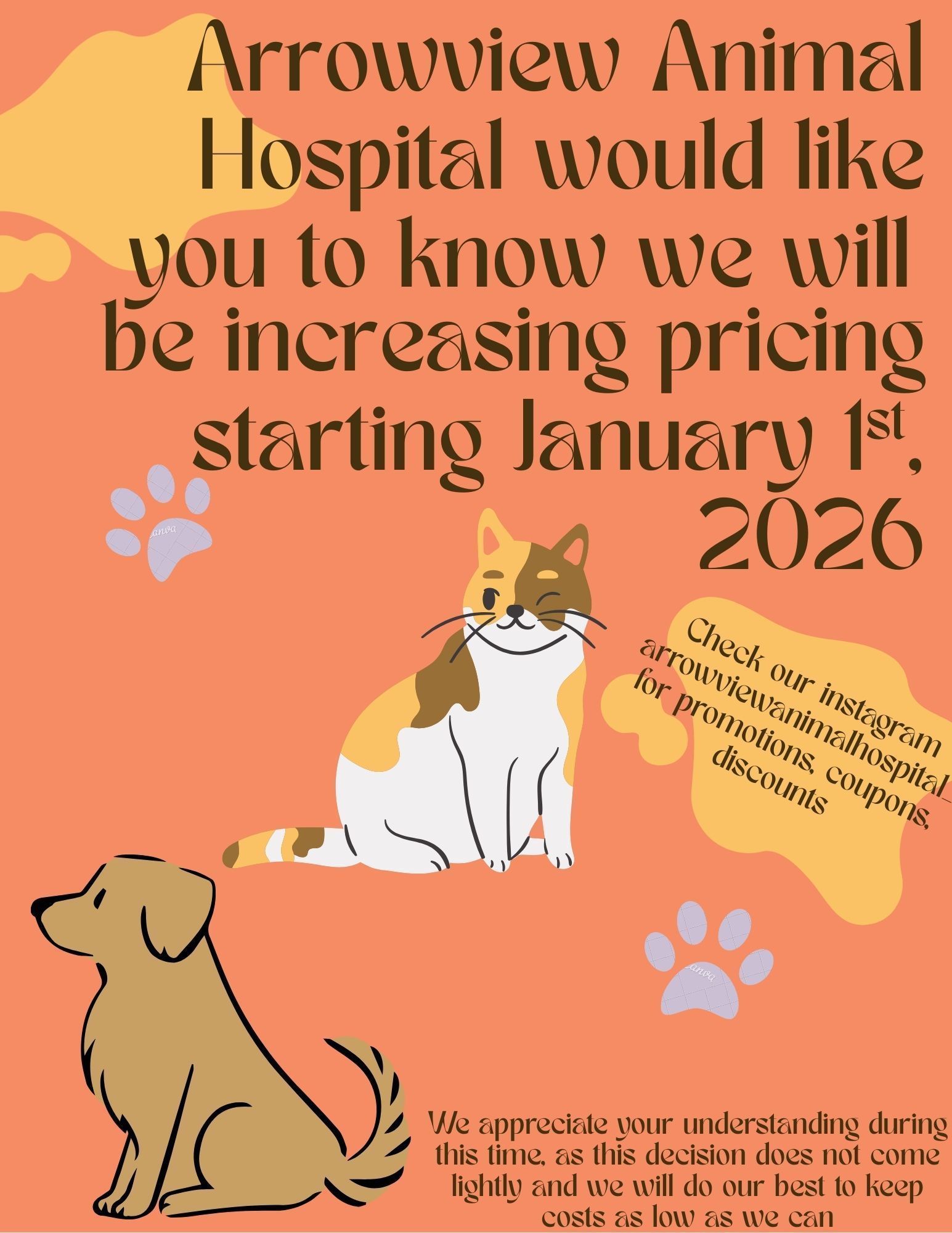 Please be prepared for unavoidable delays and busy phone lines as we all work together to meet your pet's needs in a manner that provides maximum safety for all of us. Please be advise that prices are subject to change at any moment. We thank you for your cooperation.